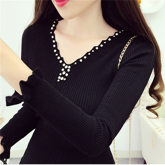 V-neck Knitted Tops Solid Slim Elasticity Knit Pullover Sweater Female