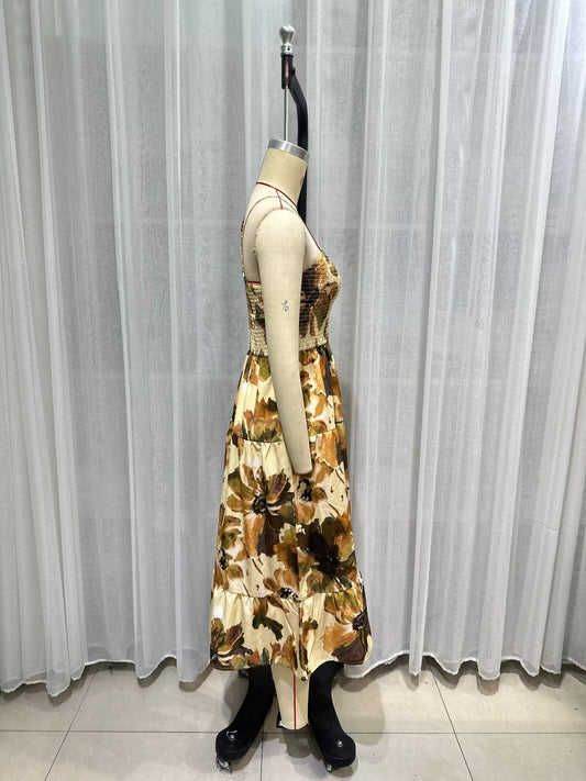 Women Retro Printed Suspender Dress Waist Controlled Slimming Zipper Off Neck Tube Top Dress