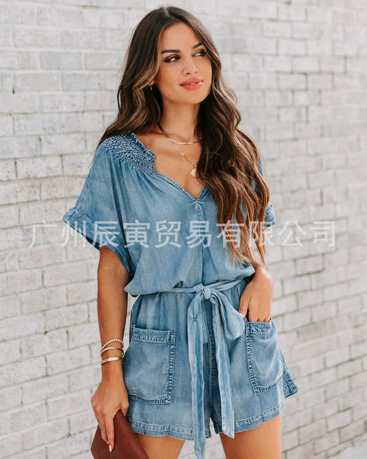 One Piece Jeans Stretch Jumpsuits Women V Neck Short Sleeve Solid Denim Casual Rompers Ladies Lace Up Playsuits Pockets
