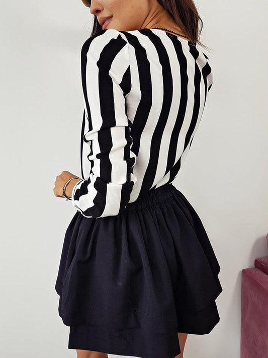 Striped Shirt Black White Elegant V Neck Button Blouse