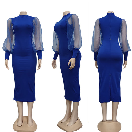 Women Clothing Mesh See-through Lantern Sleeve Dress Sheath 3 Colors