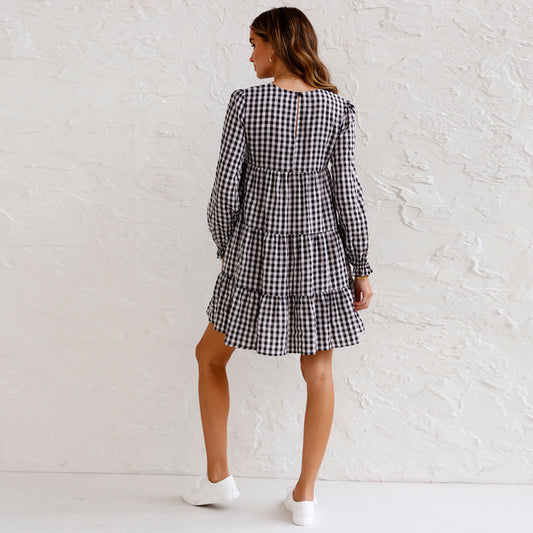 New Long Sleeve Plaid Pleated Swing Cake Dress Women Clothing
