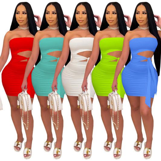 Women Clothing Fashion Summer New Fashion Sexy Sleeveless Belly-Exposed Bow Chest-Wrapped Dress