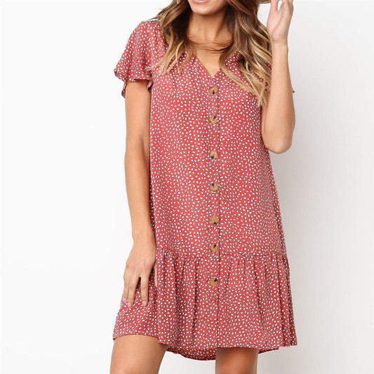 Bohemian Buttons Dot Printed Dress V Neck Short Sleeve Casual Mini Dress Sexy Loose Beach Dress