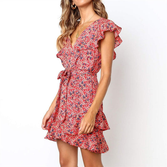Boho Ruffles Beach Dress O-neck Short Sleeve Mini Dress Ladies Sundresses
