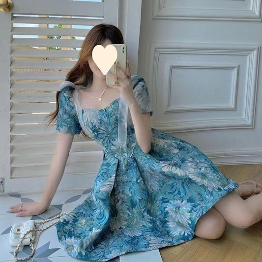 Floral Dress Women Summer French Cinched Short Dress Niche Design Sweet Puff Sleeve Dress