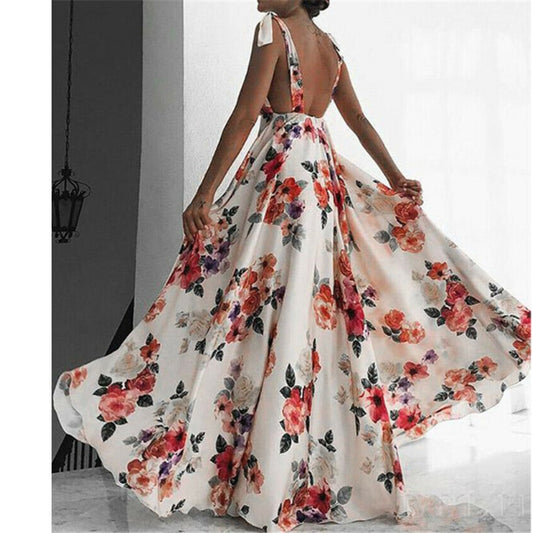 Floral Print Sleeveless V-Neck Backless Vintage Long Boho Party Cocktail Pink Dress