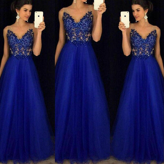 Lace Blue Dresses Ladies Sleeveless Bridesmaid Long Party Ball Prom Gown Mesh Dress