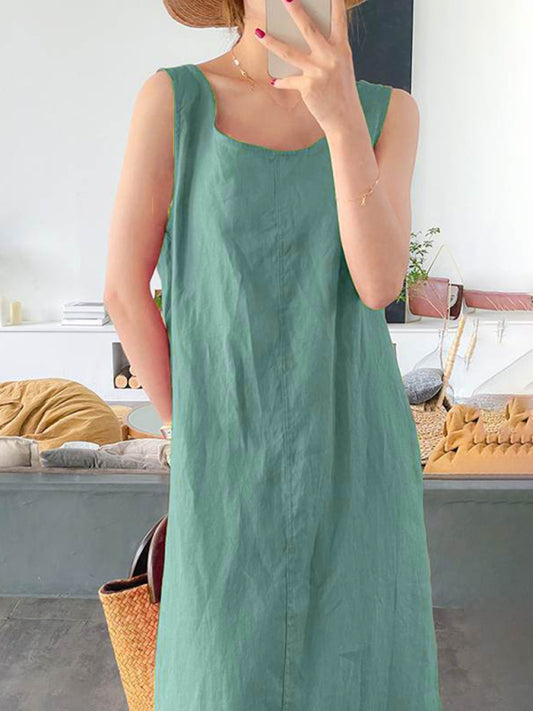 Women's Cotton Linen Simple Style Loose Pocket Round Neck Temperament Sleeveless Dress