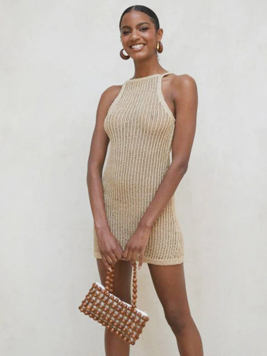 New sexy suspender leaking back square neck solid color hip-hugging gold silk slit dress