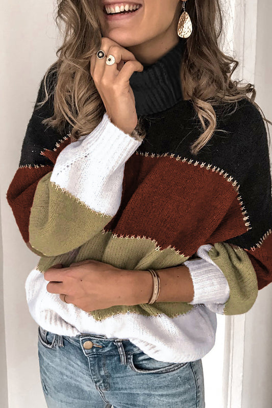 Khaki Accent Color Block Turtleneck Chunky Knit Sweater