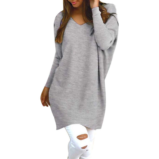V Neck Long Sleeve Tunic Pullover Loose Knitted Solid Color Women's Sweater