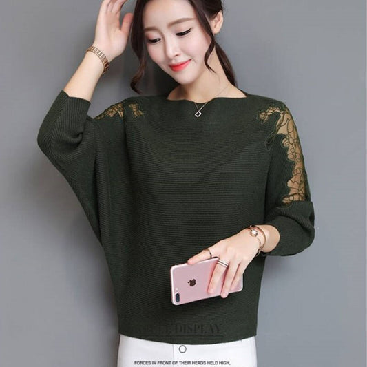 Loose Batwing Knitted Pullover Tops Lace Decoration