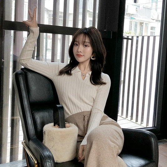 Turn-down Collar Fall Winter Solid Color Pullover Slim Knitted Sweaters