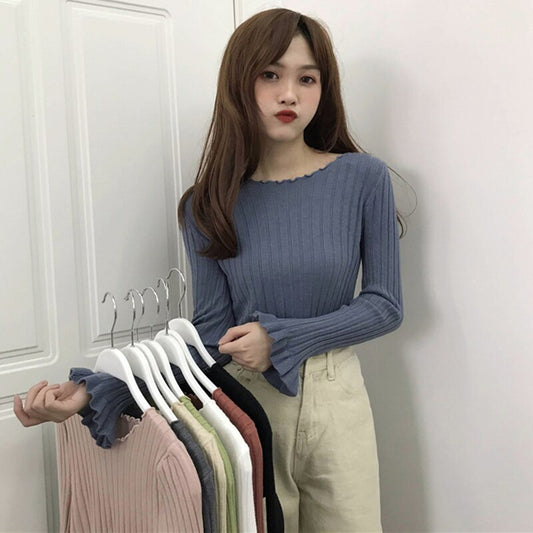 Ruffles Pullovers Solid Flare Sleeve Women Sweaters Slim