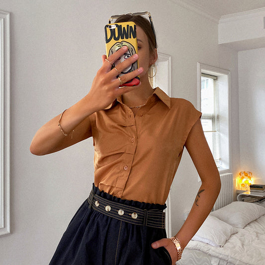 Elegant lapel office lady blouse t shirt solid pleated sleeveless women blouses Summer casual women fashion tops