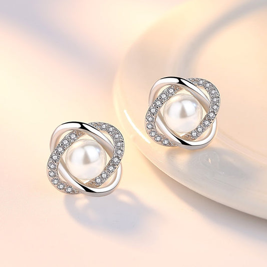 925 Sterling Silver High Quality Crystal Zircon Pearl Flower Retro Earrings