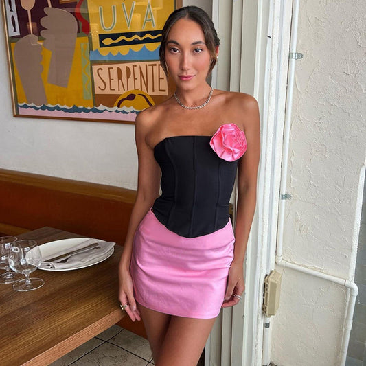Spring Summer Women 3D Clothing Sexy Contrast Color Floral Waist Skirt Sexy Two Piece Set