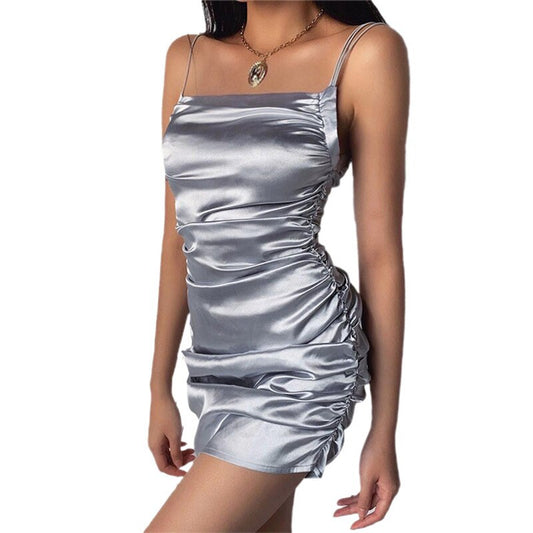 2020 Satin Silk Women Mini Dress Spaghetti Strap Summer Pleated Dress Seleeveles Silver Party Dresses Bodycon Bandage Dresses