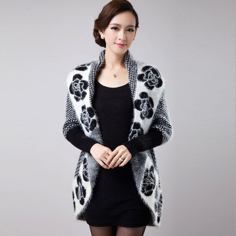 Back Long Knitted Printed Shawl Open Stitch Jacquard Sweater