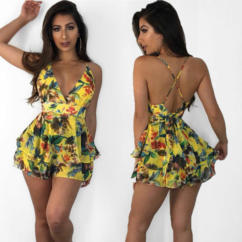 Floral Sleeveless Strap V-neck Rompers Backless