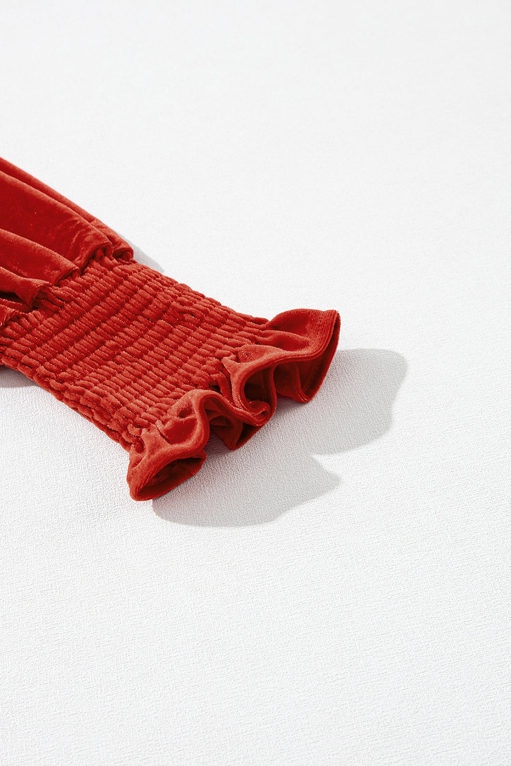 Red Clay Frilled Neck Smocked Bodice Velvet Dress