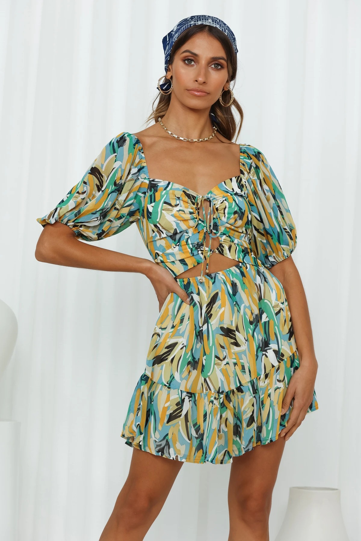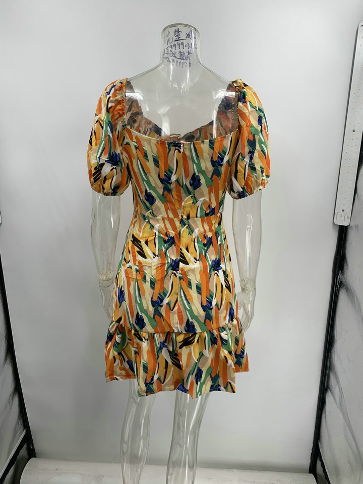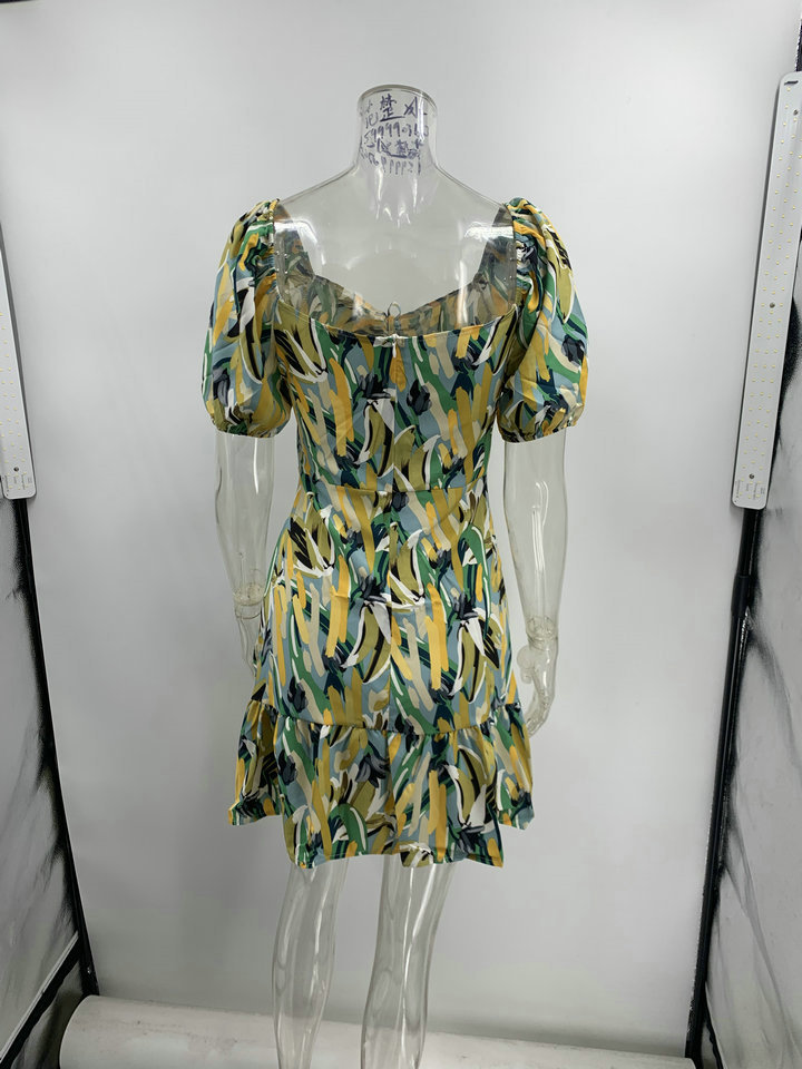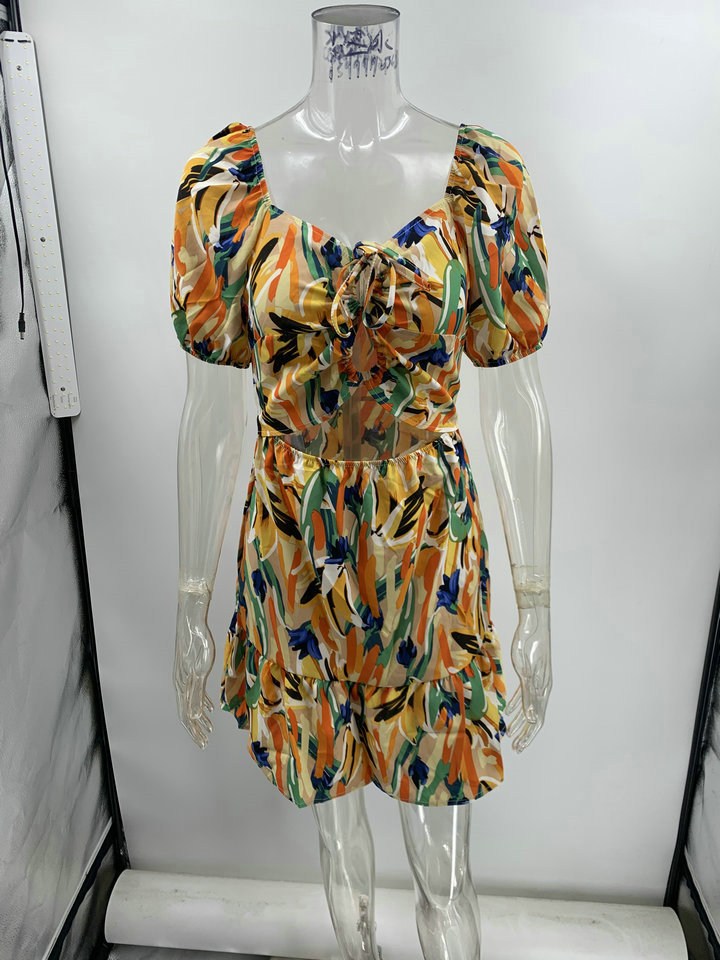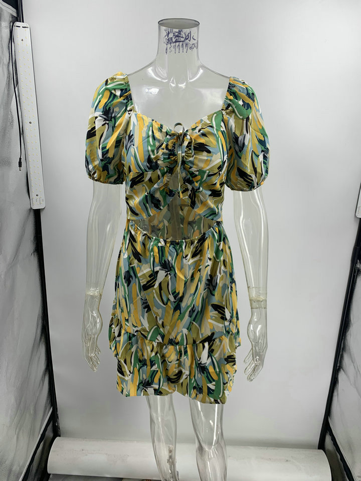 Spring Summer New Sexy Backless Square Collar Drawstring Strap Printing Short Sleeve Dress for Women