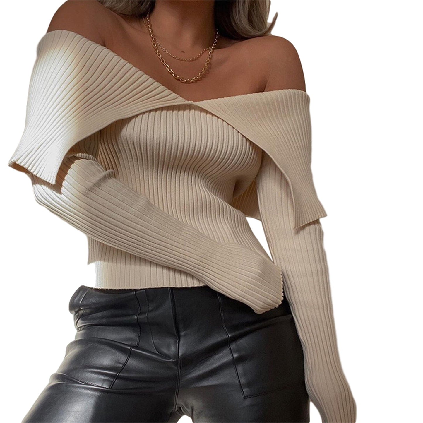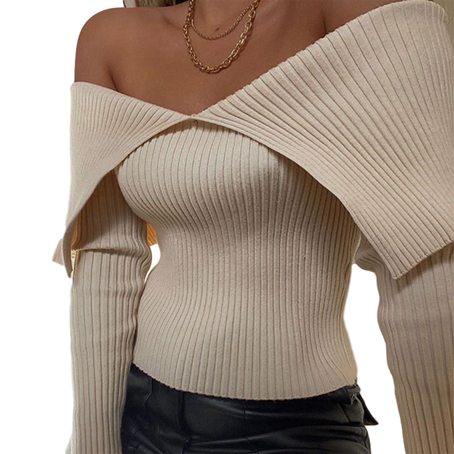 Long Sleeve T shirt Fashion Solid Color Wide Lapel Off-the-shoulder Exposed Navel Top