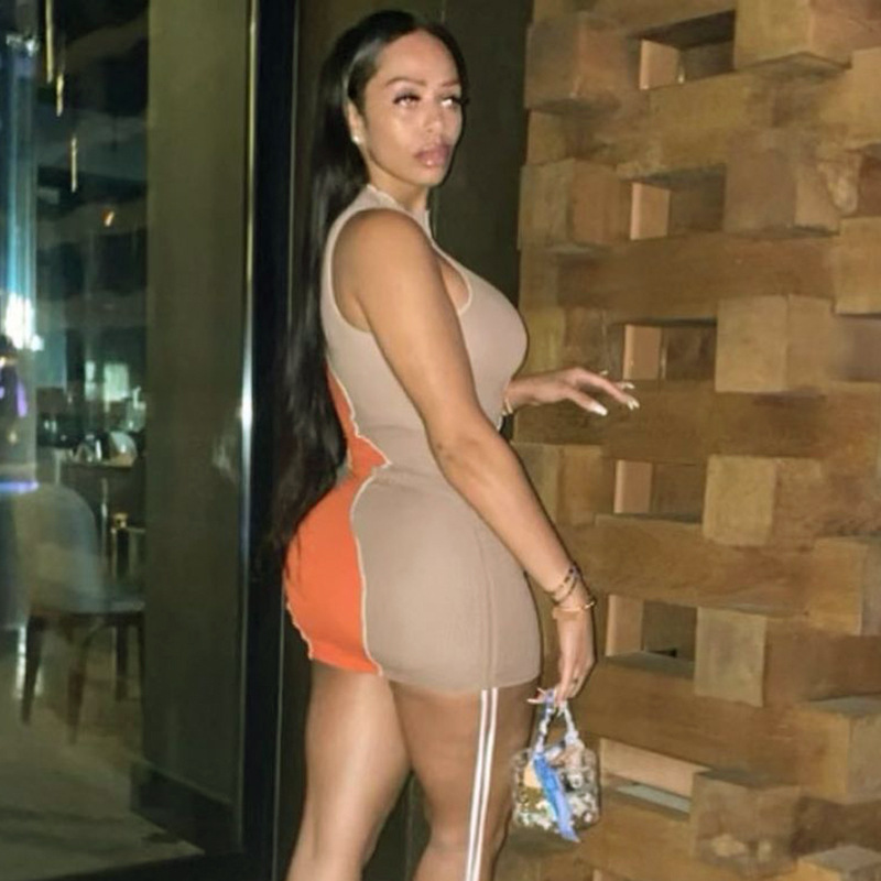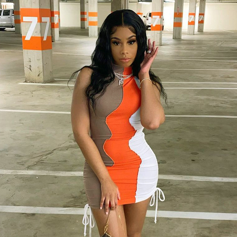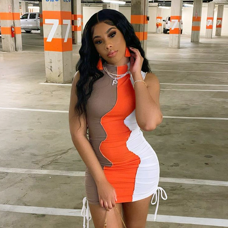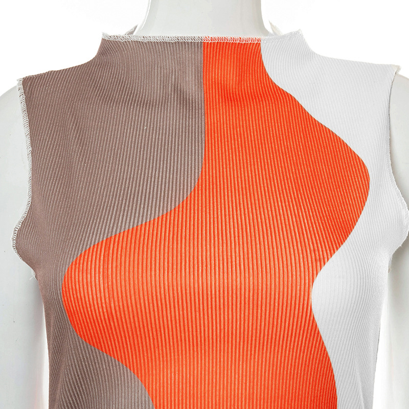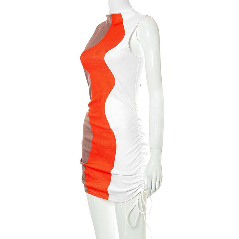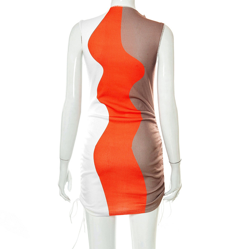 Women Clothing 2021 Summer New round Neck Sleeveless Printing Color Contrast Pleated Tie Short Party Dress