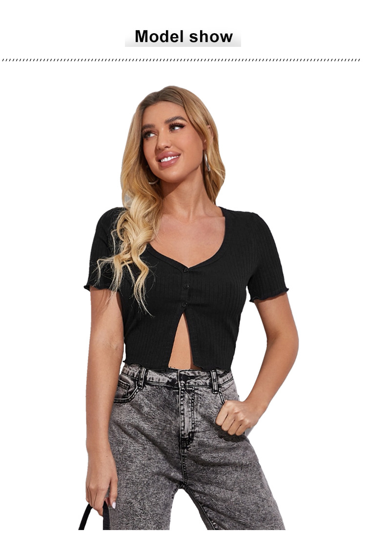 Women Clothing Slim Fit Show Umbilical Top T-shirt Peach Collar Short Sleeve Button Knitted Bottoming Shirt Short