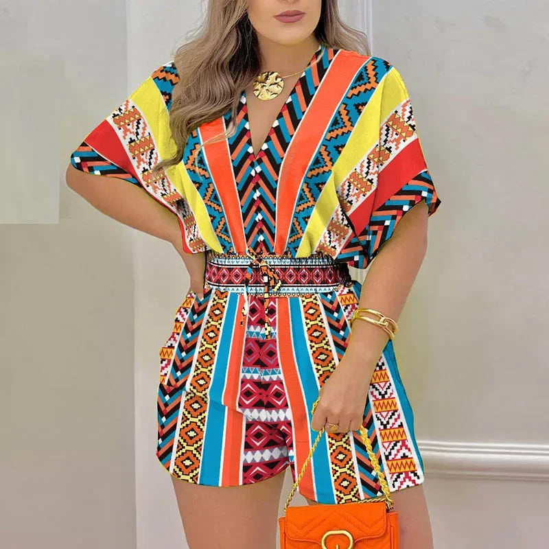 Women Elegant Sexy V Neck Romper Summer Casual short sleeve Playsuits 2023 Lady Fashion printed Elastic waist One Piece Overalls