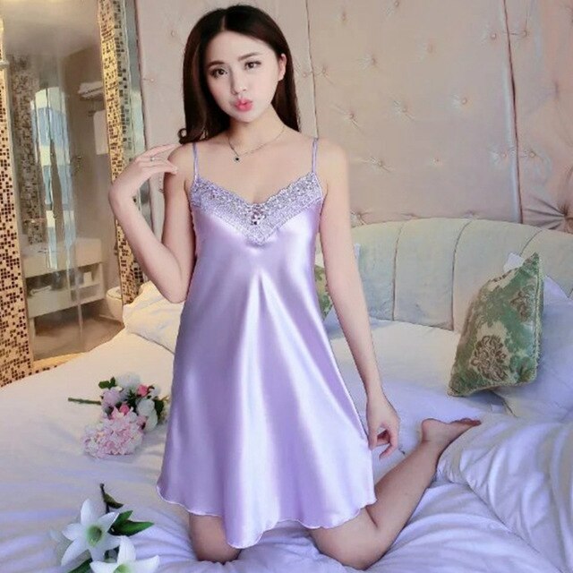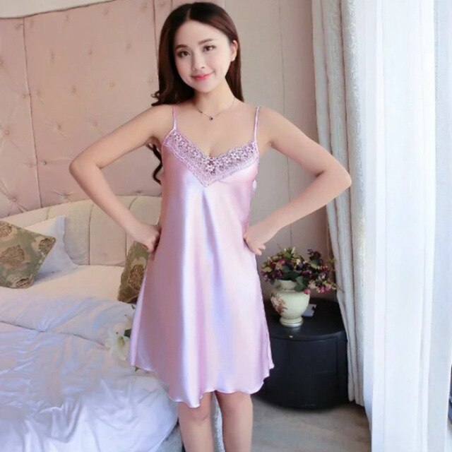 Women Sexy Lace Satin Nighty Underwear Lingerie Hot Summer V-Neck Faux Silk Spaghetti Strap Night Dress Femme Pajamas Sleepwear