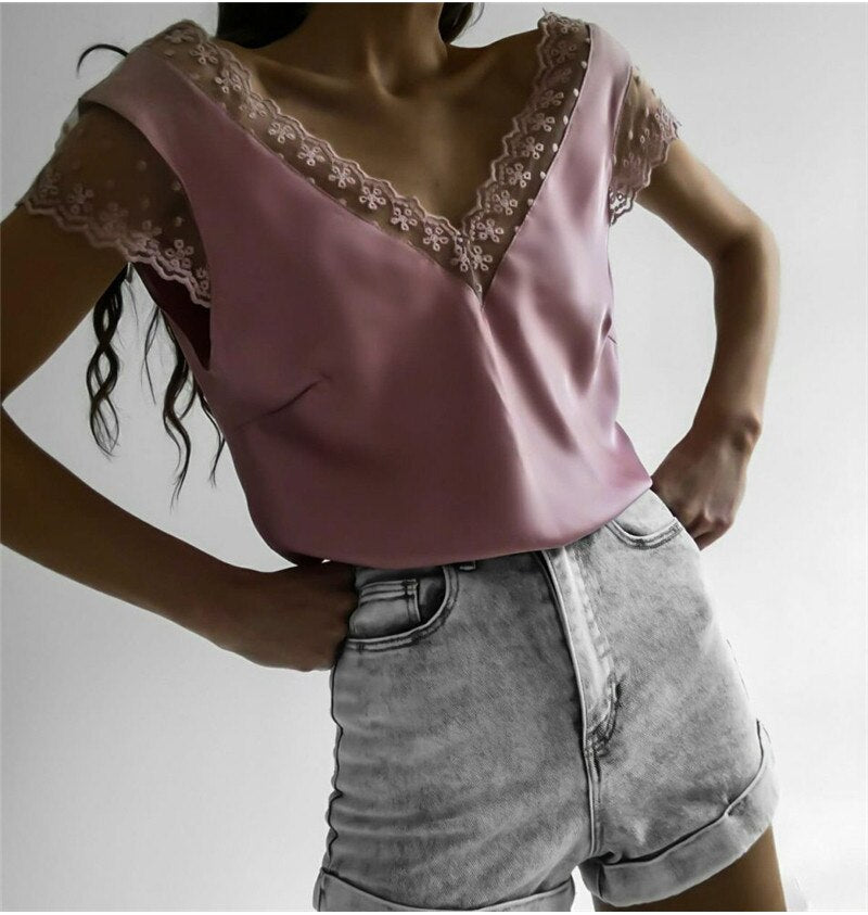 Short Sleeve Lace Tops V Neck Harajuku Blouse