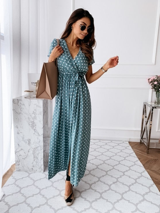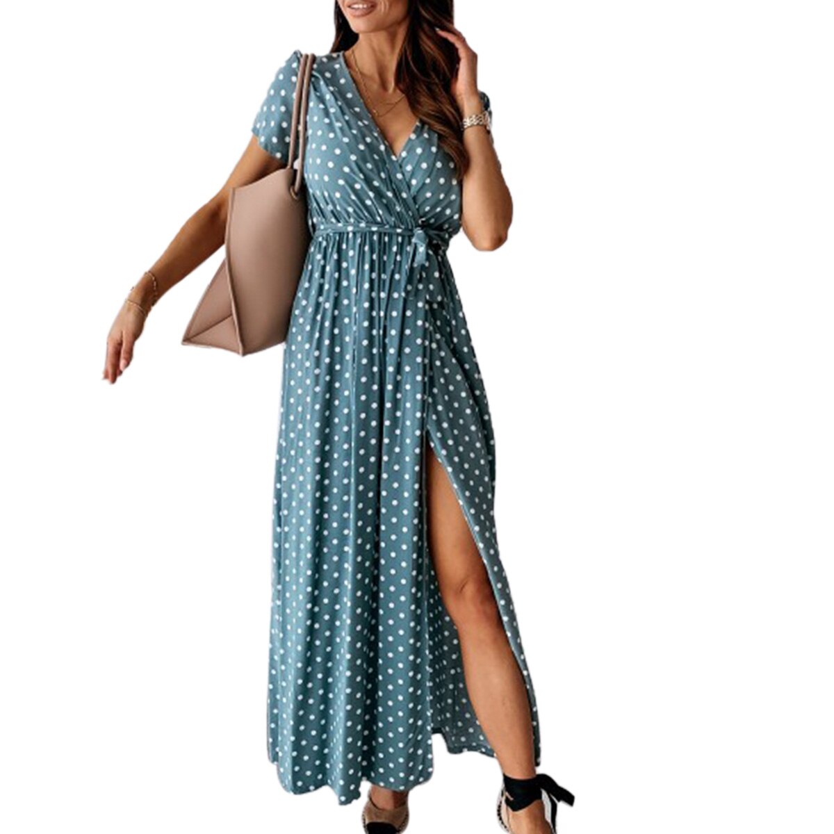 2020 New Casual Women Long Maxi Dress High Waist Female Loose Summer Split Holiday Dress Dot Print V Neck New Chic Beach Dresses