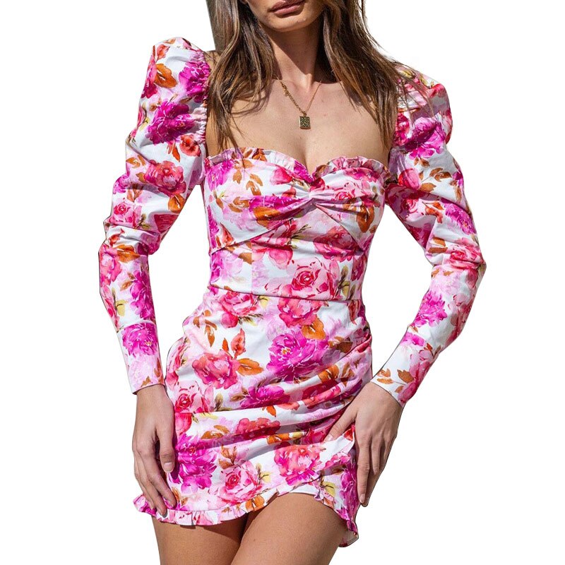 Flower Dress Sexy Prom Ball Mini Dresses Women Long Puff Sleeve Slim Club Dress