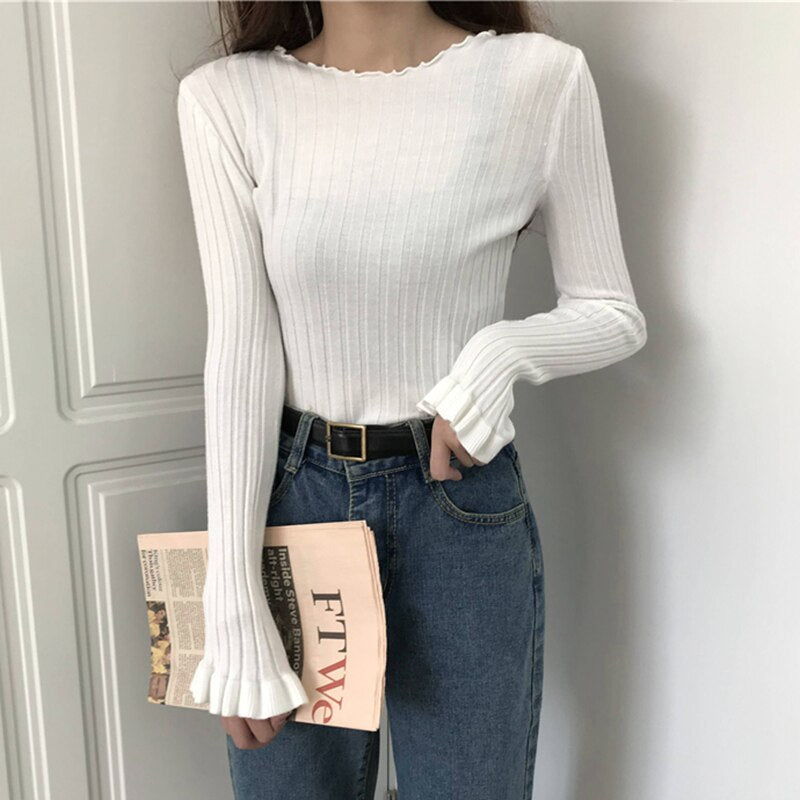 Ruffles Pullovers Solid Flare Sleeve Women Sweaters Slim