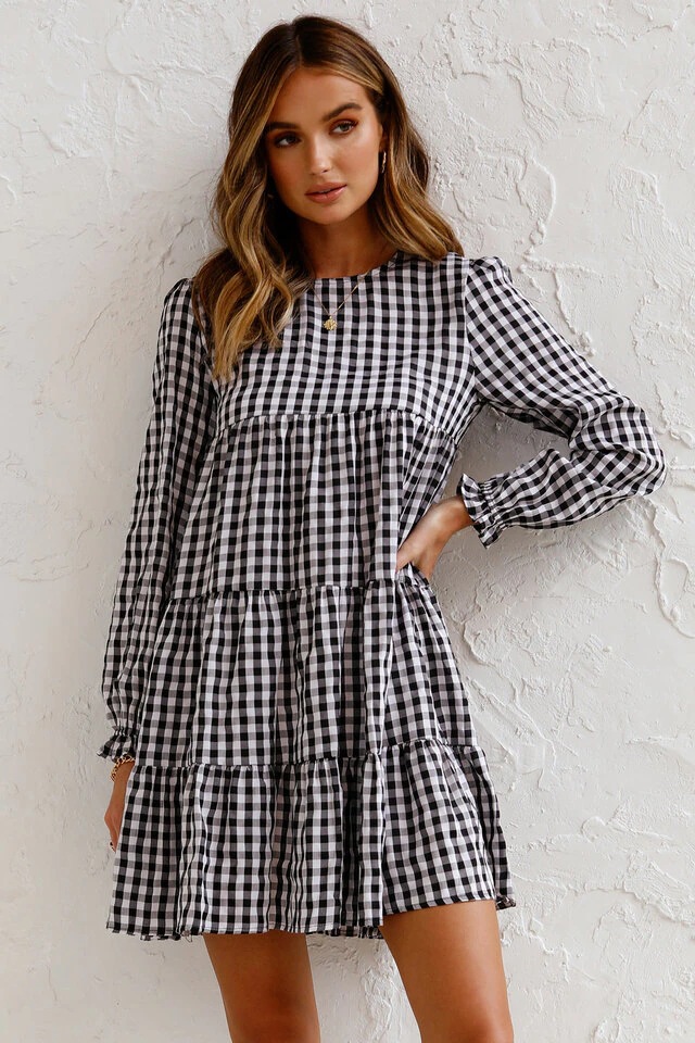 Autumn New Long Sleeve round Neck Swing Plaid Loose Dress for Women