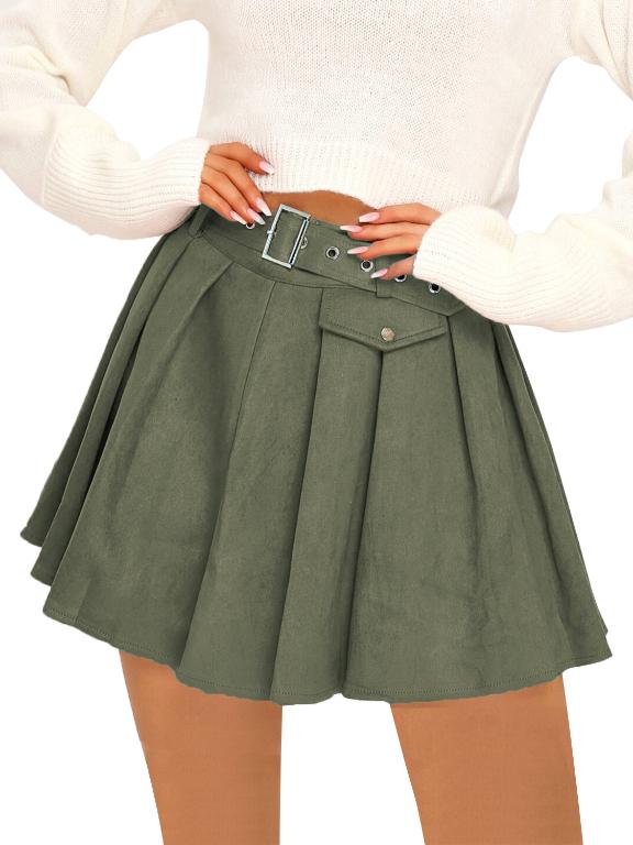 Berrygo Solid Pleated Ladies Dress Sexy Commuter A-Skirt Metal Belt
