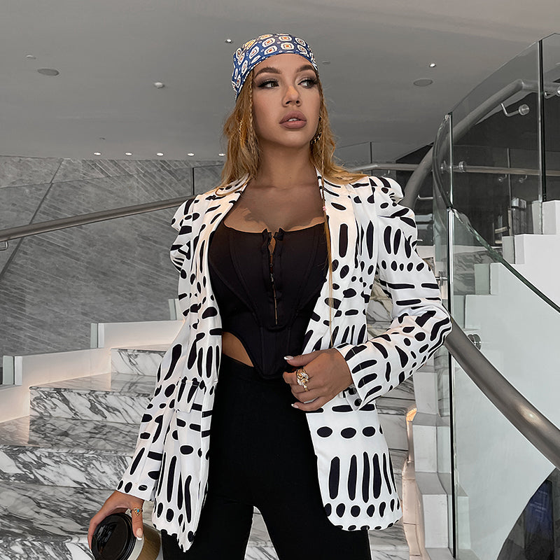 Chic Geometry Prited Office Ladies Blazer Autumn Fashion White Long Sleeve Jacket Overwear Elegant Women Blazer Coat