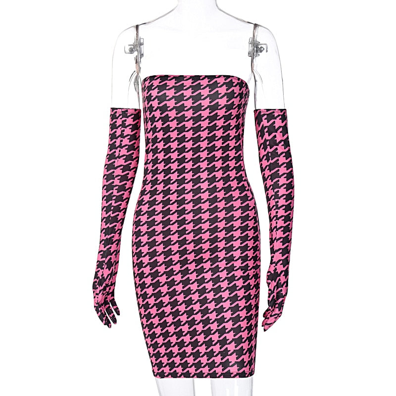 Houndstooth Print Women Tube Mini Dress Sleeve Gloves Bodycon