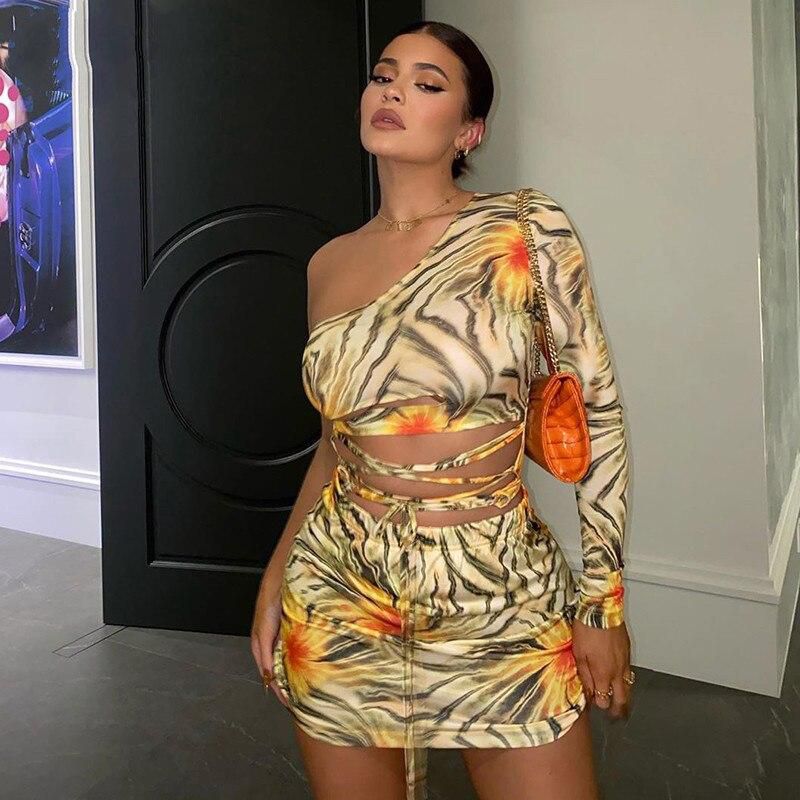 Tie Dye Floral Print Hollow Out Lace Up Cross One Shoulder Long Sleeve Women Mini Dress