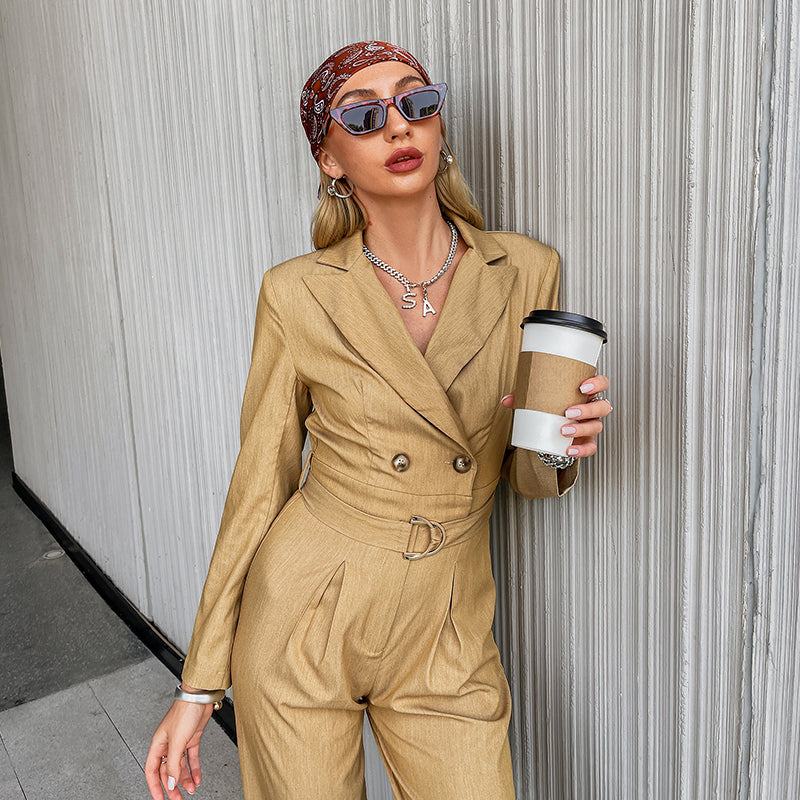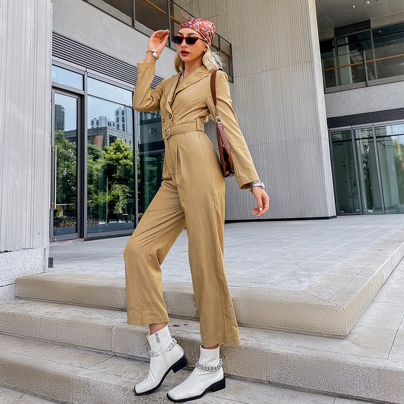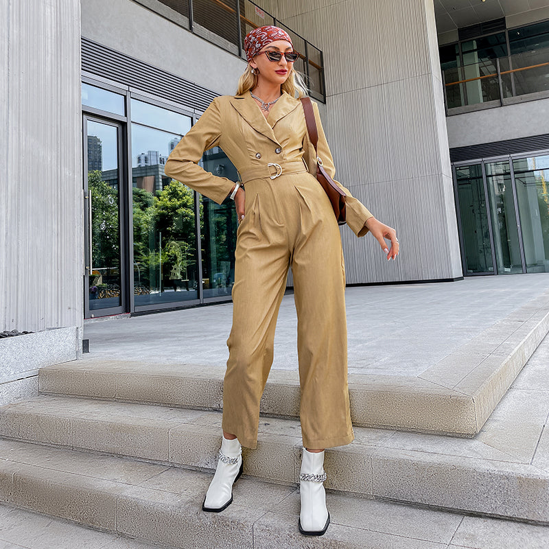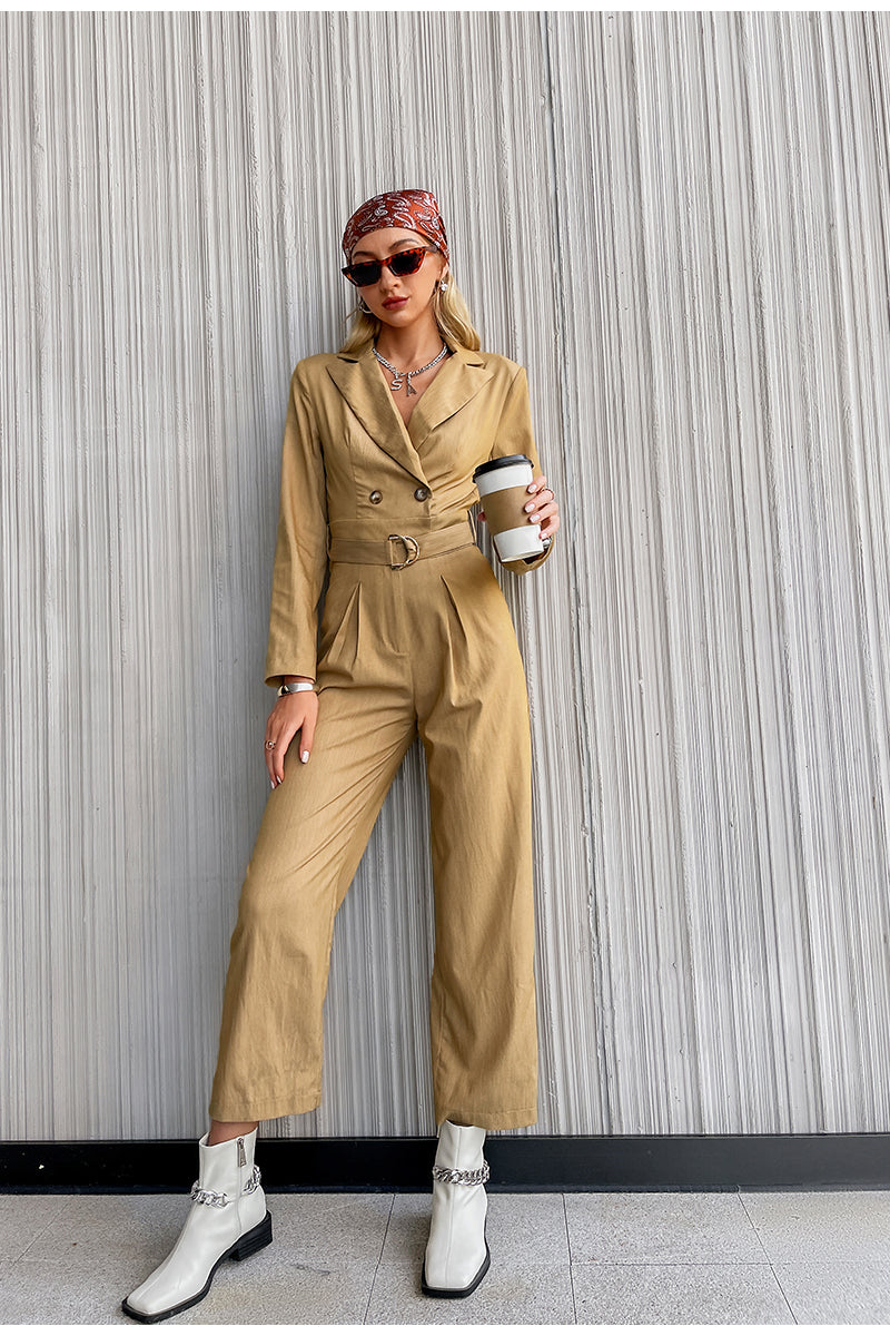 High Street Shirt Collar Belt Jumpsuit Solid Casual Button Chain Overalls Autumn Office High Waist Ladies Playsuit