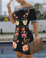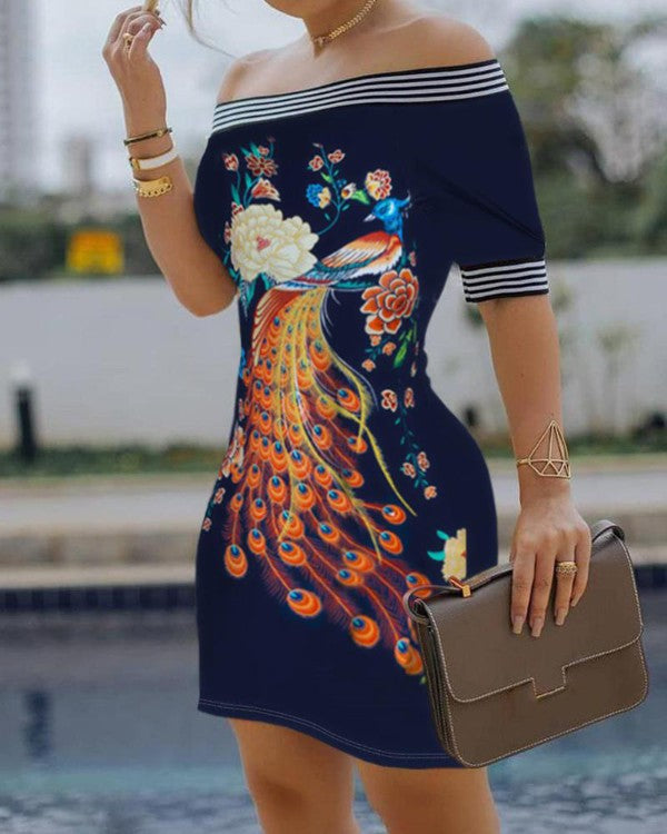 Elegant Slim Fit Print Bodycon Dress Off Shoulder Bird Pattern Striped Tape Splicing MiniDress