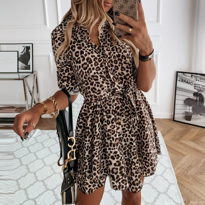 Leopard Shirt Dress Long Sleeve Turn-down Collar Sashes Mini Dress Single Button