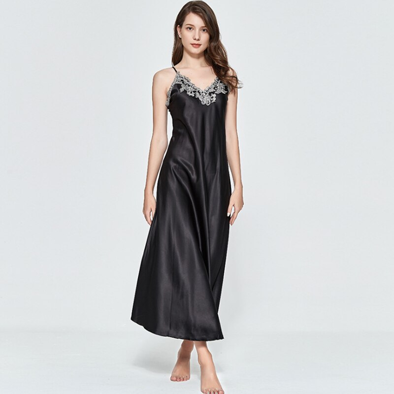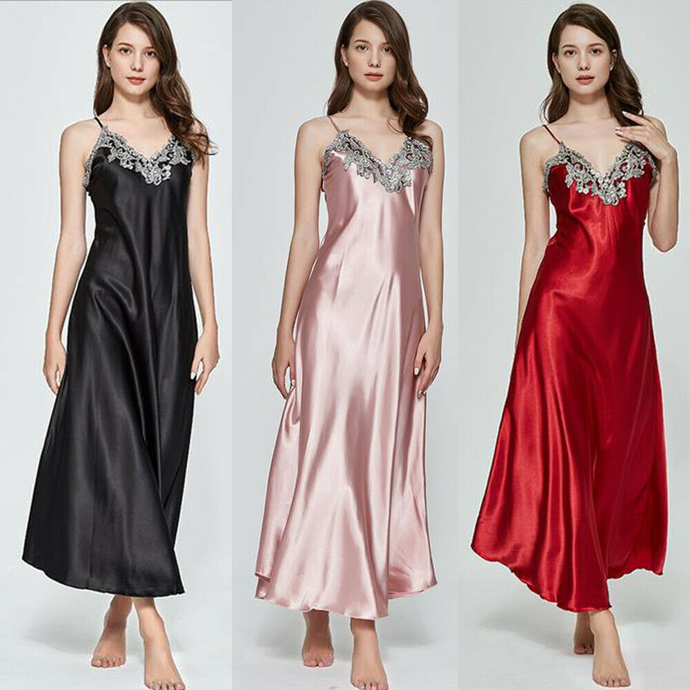 Hot Sale High Quality Women Satin Silk Lace V-neck Spaghetti Strap Night Dress Nightdress Sleepwear Ladies Long Nightgown