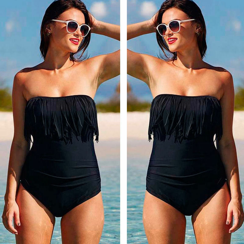 One-Piece Bikini Solid Off Shoulder Tassels Swimsuit Beachwear Swimwear Ladies Push Up Plus Size XL-4XL Swimwear