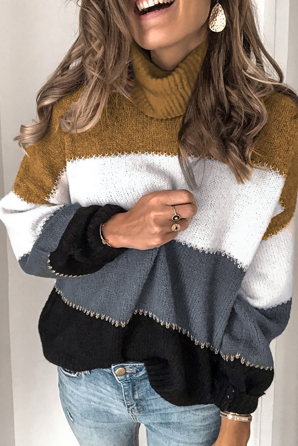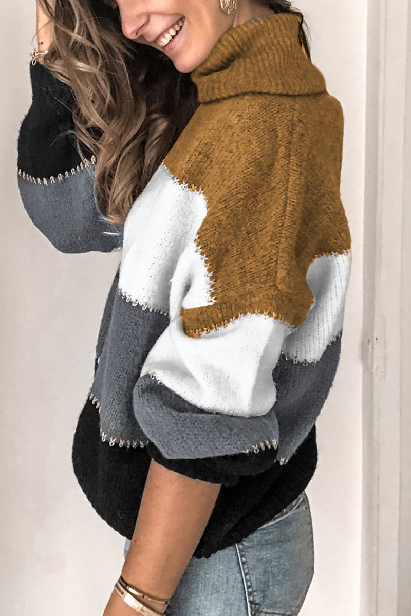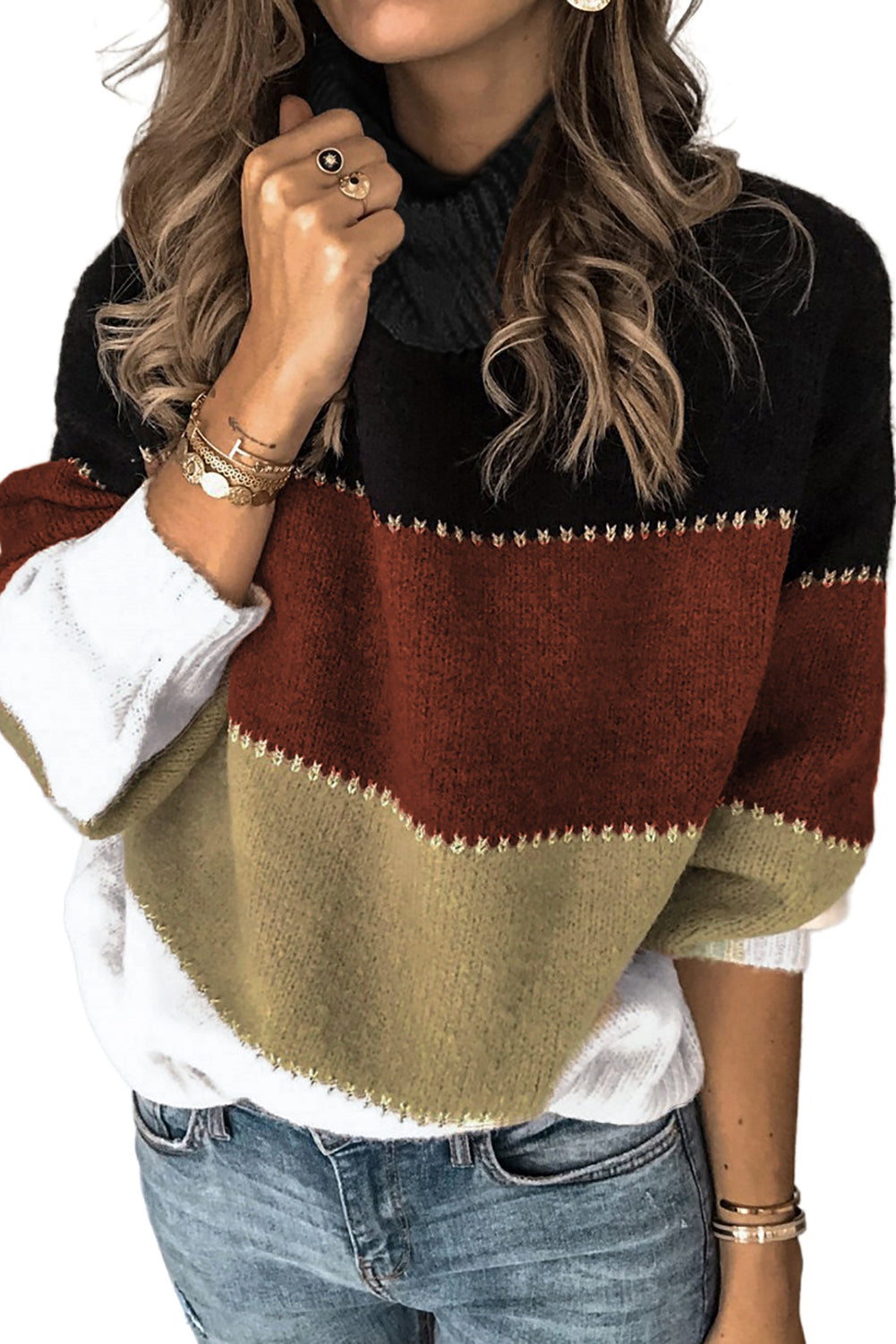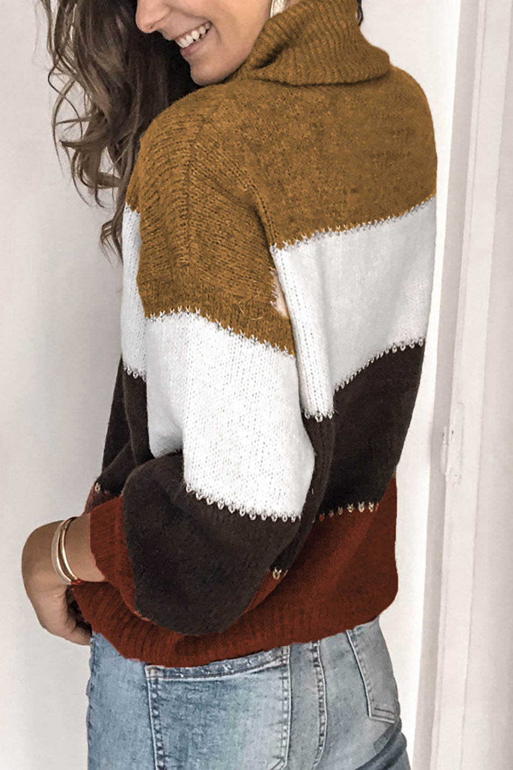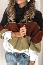 Khaki Accent Color Block Turtleneck Chunky Knit Sweater
