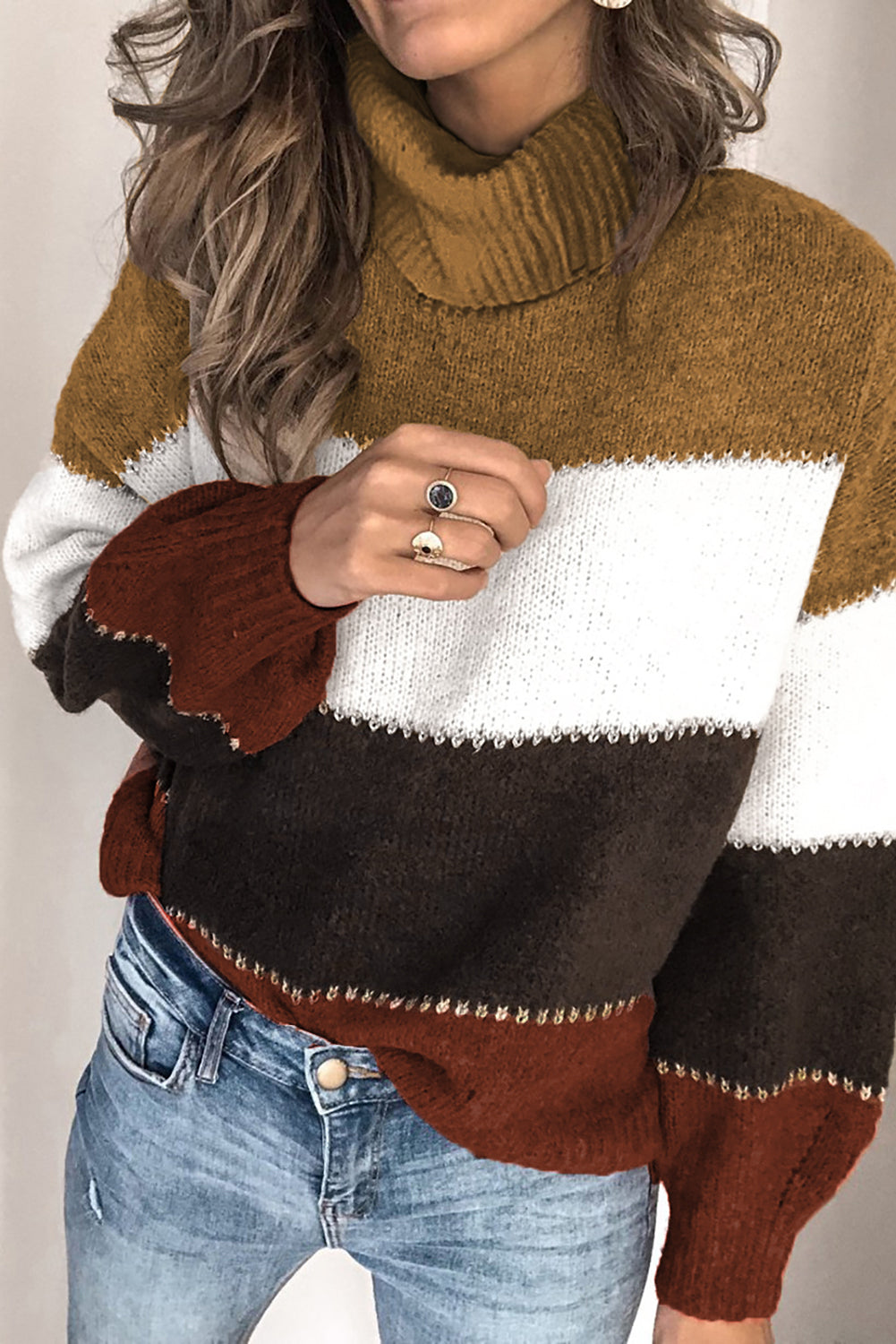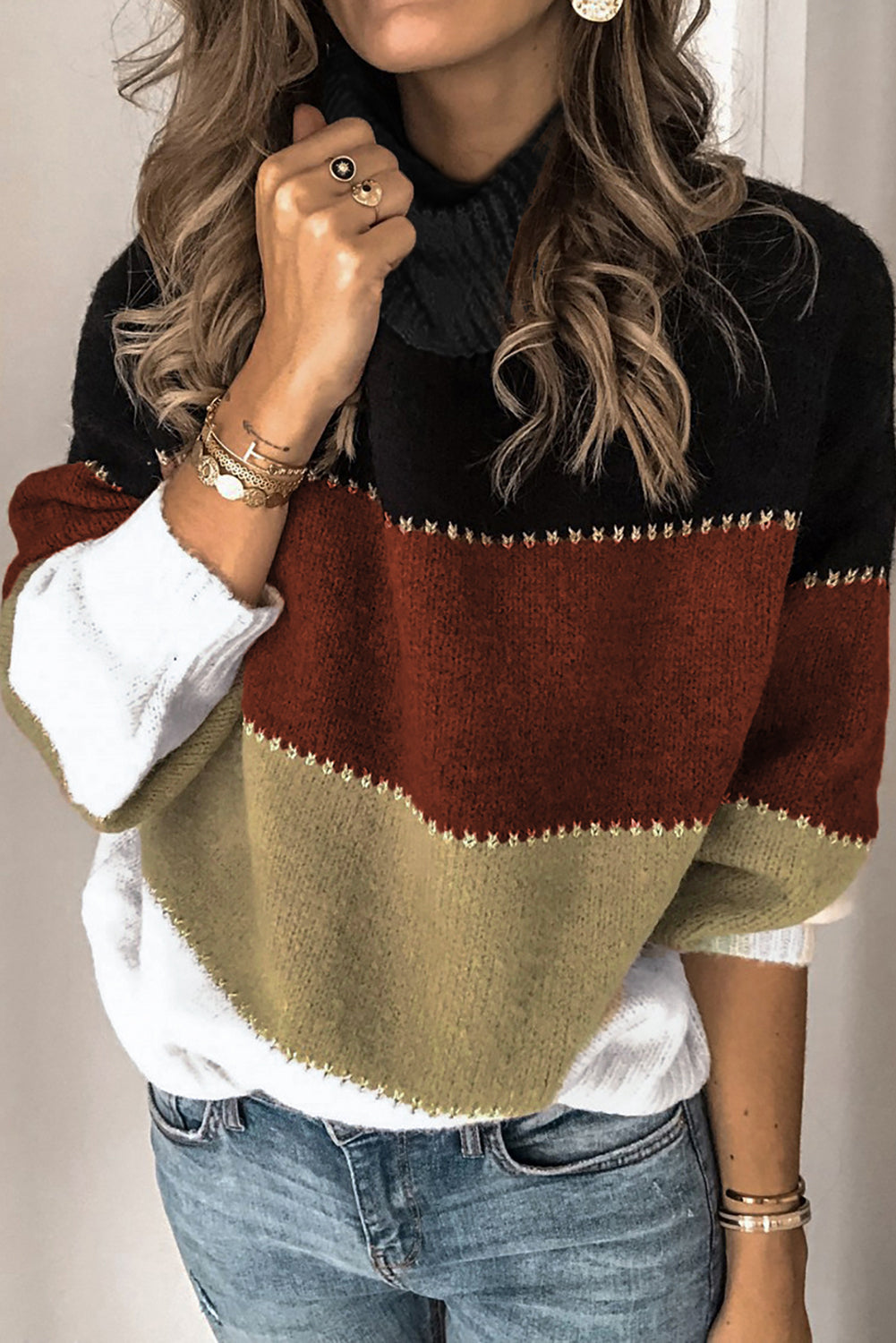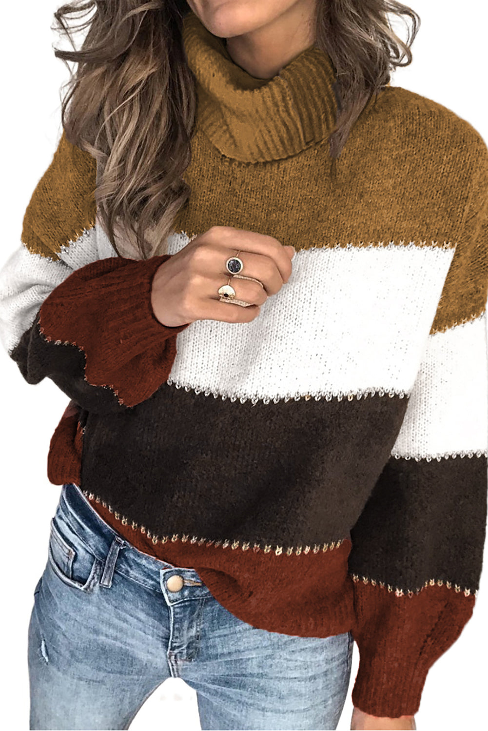 Khaki Accent Color Block Turtleneck Chunky Knit Sweater