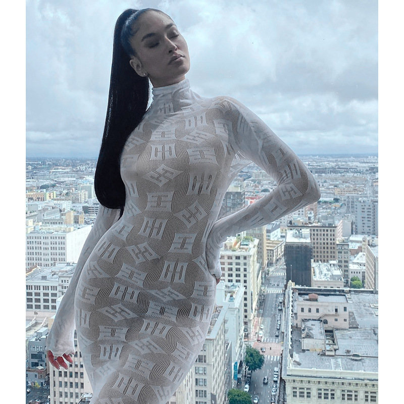 Long Sleeve Letter Graphic Print See through Sexy Dress Sexy Tight Stretch Dress Women