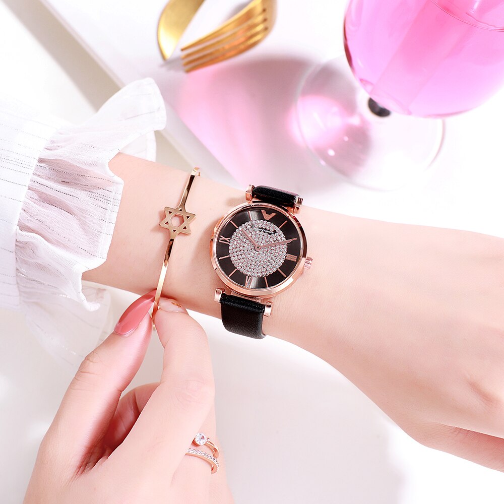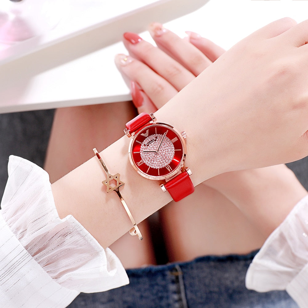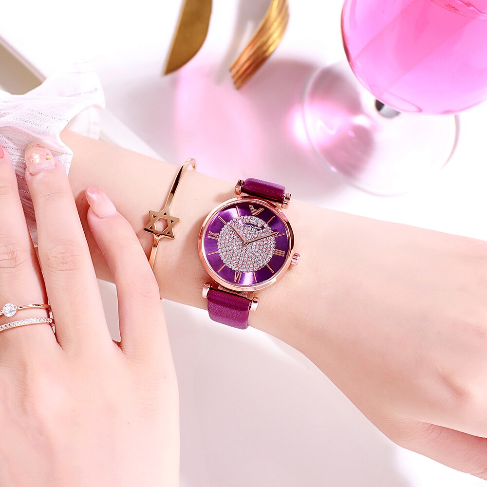 Rhinestone Leather Watches Women Alloy Analog Quartz Red Purple